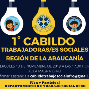 El Departamento de Trabajo Social de la Universidad de La Frontera ha organizado, para el día miércoles 13 de noviembre de 2019, el Primer Cabildo de Trabajadores y Trabajadoras Sociales. Esta actividad, se desarrollará desde las 17:3o horas en sala Aula Magna de nuestra Universidad.